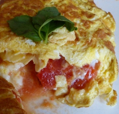 - Lorsque l’omelette a pris d’un côté, la retourner, la garnir alors de la purée de tomates, de tranches de mozzarelle et quelques feuilles de basilic.