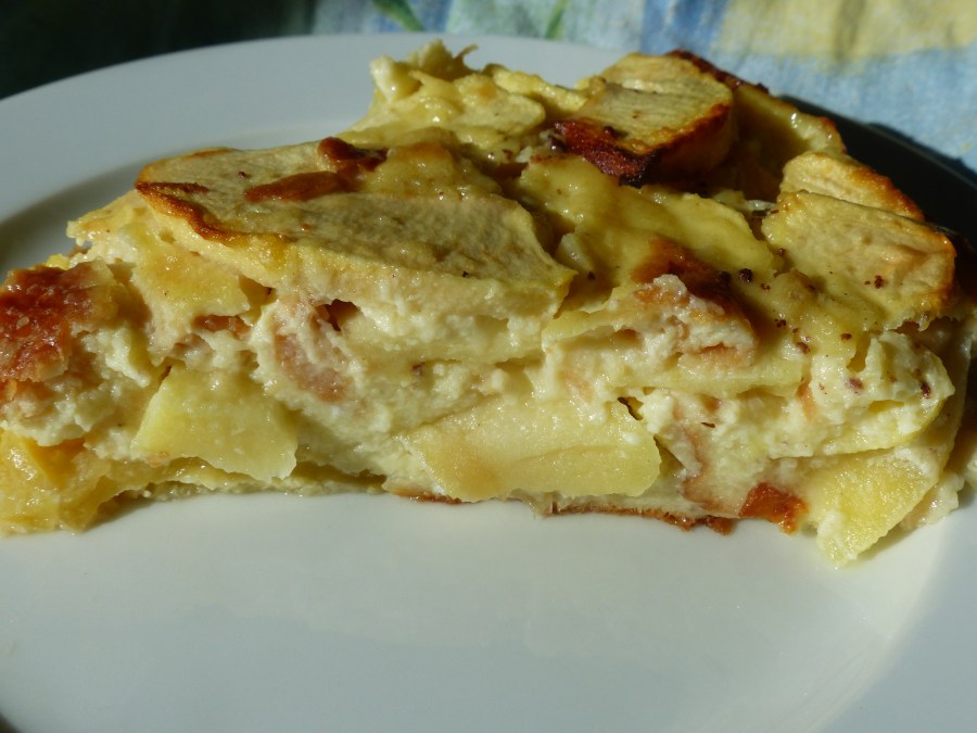 Voici une recette » cuisine du placard ».. utilisant un reste de pain au lait et des pommes. Cela donne un dessert qui ressemble à un flan et peu sucré.