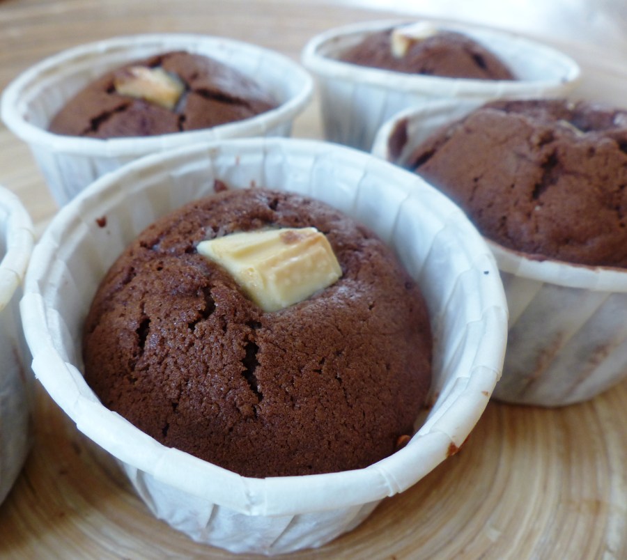 - Verser dans des moules à muffins, ajouter un carré de chocolat blanc et faire cuire environ 20 mn.