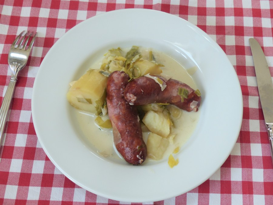 - Vérifier la cuisson des pommes de terre, puis poivrer, ajouter la crème fraiche, laisser cuire encore 1 minute puis servir aussitôt, la saucisse avec ses légumes et son bouillon.