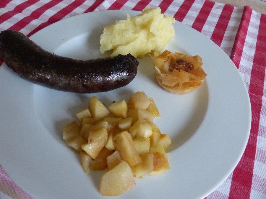 - Plonger dans l’eau bouillante 5 minutes les boudins pour éviter qu’ils n’éclatent à la cuisson, puis mettre 5 minutes à cuire dans la poêle des fruits.
