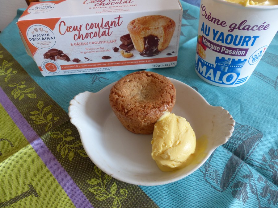 et un coeur coulant au chocolat de la maison Prolainat…à faire chauffer quelques minutes au four, résultat : un emballage croustillant, (dans la pâte on retrouve des morceaux d’amandes et noisettes) et au coeur un coulant de chocolat.