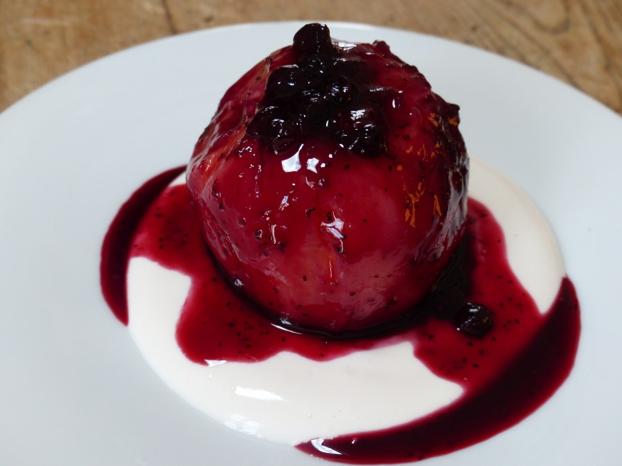 - Sur chaque assiette, disposer une ou 2 cuillères de fromage blanc légèrement sucré, puis poser une pêche et arroser d’un peu de jus au cassis.