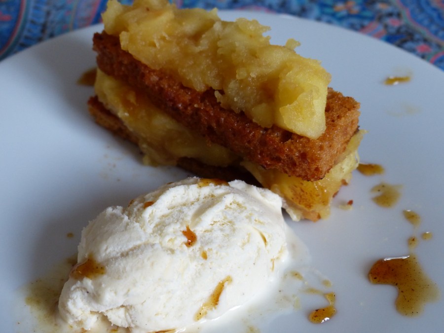 - Sur les assiettes, disposer la tranche de pain d’épices, ajouter les pommes chaudes, et décorer avec une boule de glace vanille.
