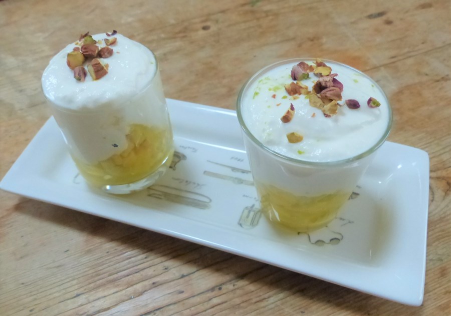 - Répartir dans des verrines la salade de fruits, recouvrir de la mousse de petits suisses.