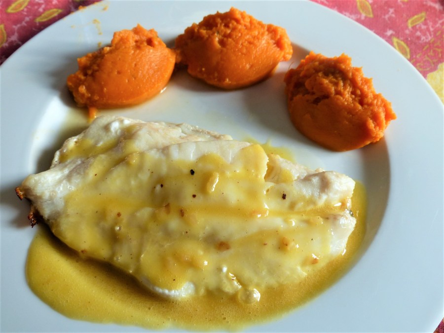 - En accompagnement j’ai servi de la purée de patate douce, légèrement crémée et avec quelques gouttes de jus d’orange et assaisonnée au poivre de Timut.