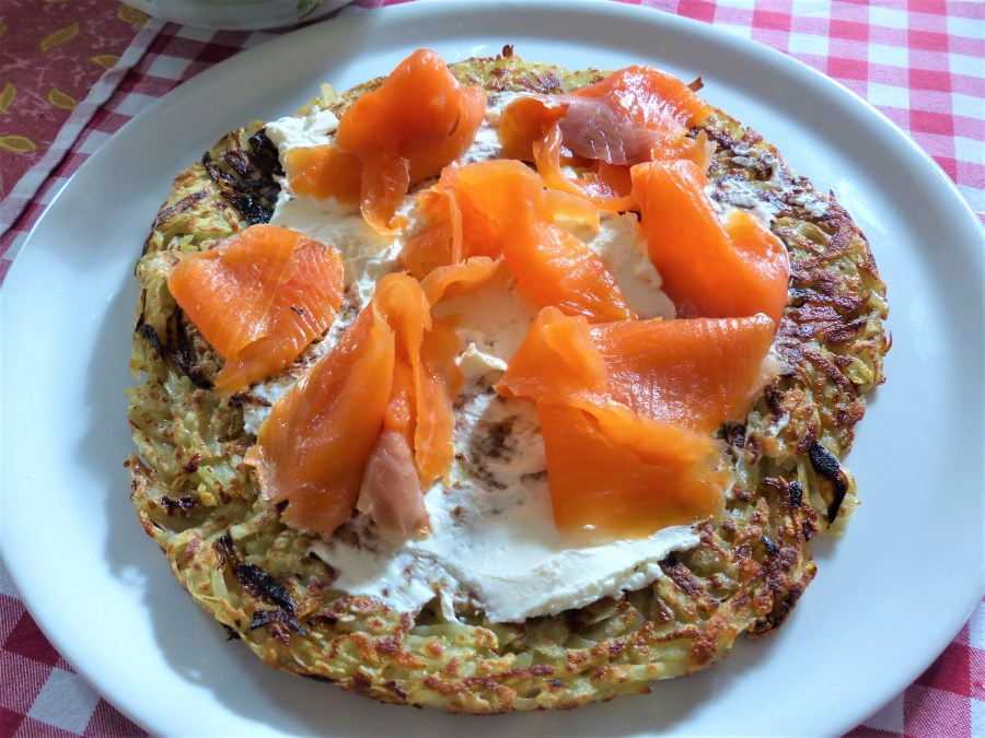 - Disposer le rosti sur le plat, tartiner de fromage frais, puis répartir les tranches de truite fumée coupées en 2..