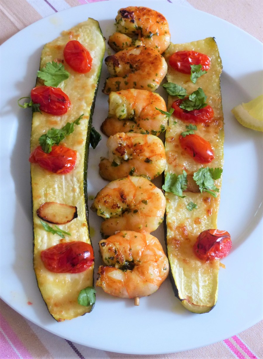 Courgettes en tranches cuites au four, servies ici avec des brochettes de crevettes marinées à l’ail des ours….
