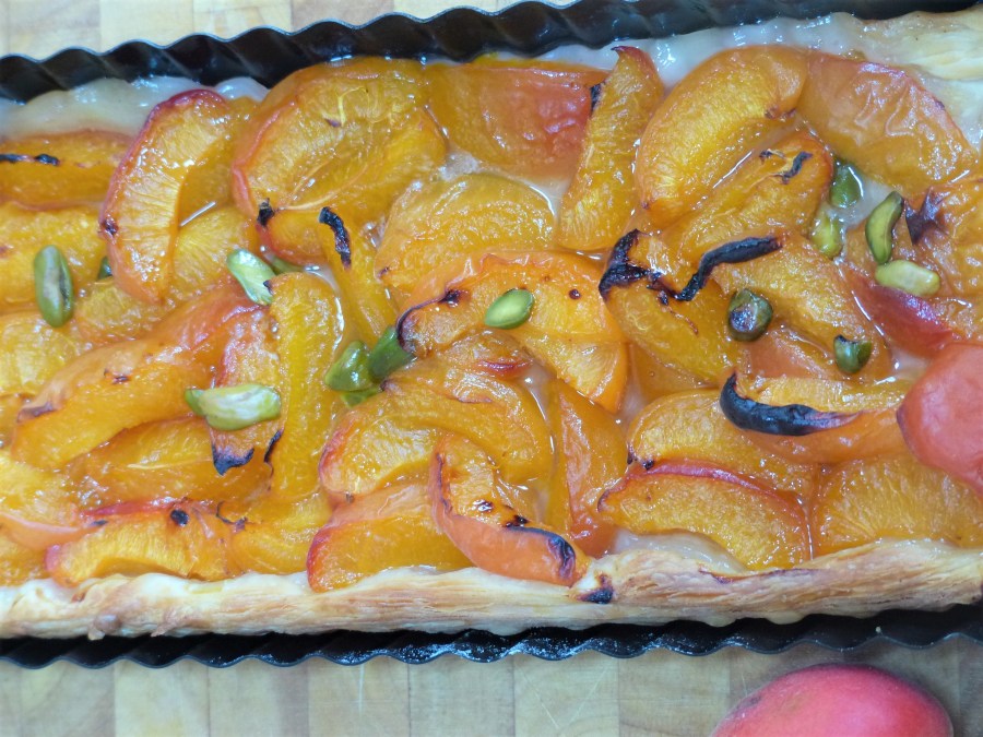 - Disposer les tranches d’abricots sur la pâte, ajouter quelques noisettes de beurre, saupoudrer avec le sucre cassonade et les pistaches ou amandes.