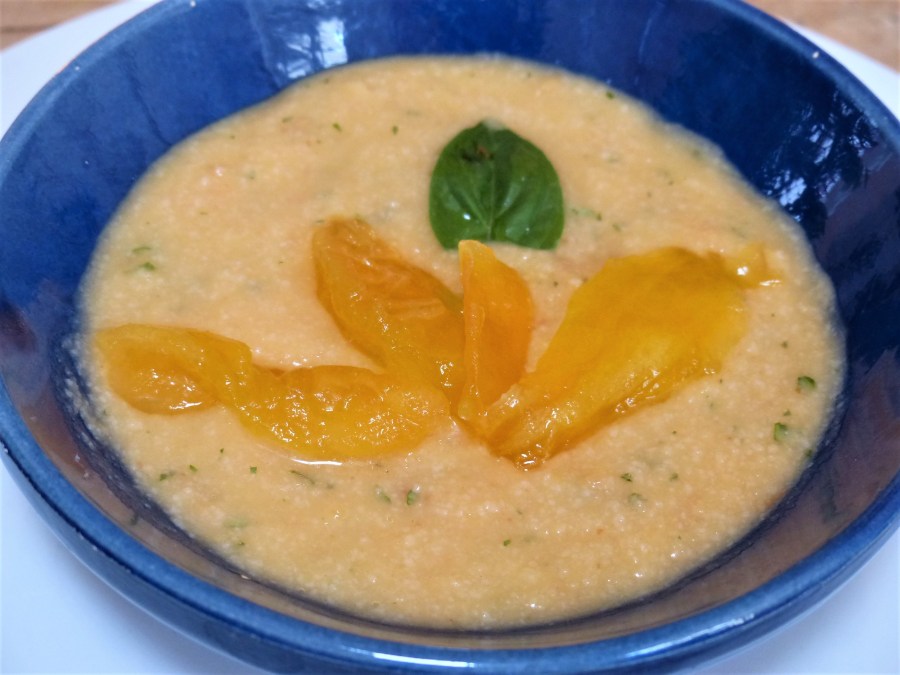 Quel plaisir de déguster un gaspacho quand il fait chaud! Voici une recette un peu différente de mon classique gaspacho. Je l’ai préparé sans poivron, uniquement avec de belles tomates bien mûres.