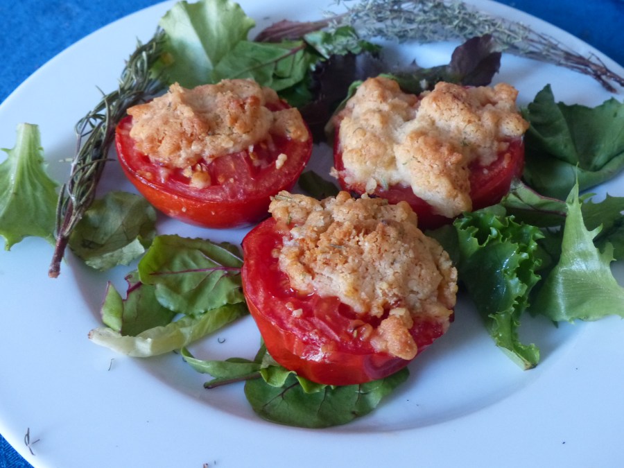 - Ajouter le crumble sur chaque tomate, arroser d’un filet d’huile d’olive et faire cuire pendant 15 minutes environ th 180°, le crumble doit juste dorer.