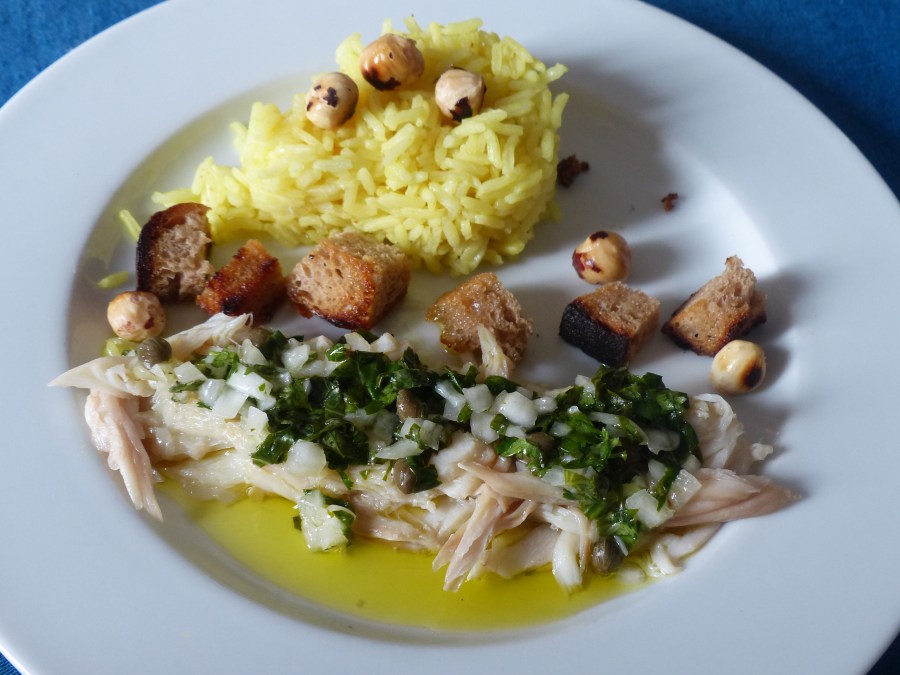 Pour rappeler la raie à la grenobloise, j ai agrémenté le plat de petits croûtons, et noisettes grillées et ajouté des câpres dans la vinaigrette…