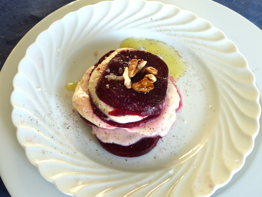 une idée de dip pour changer…. à mettre en pot pour l’apéritif avec des bâtonnets de légumes, des feuilles d’endives, des tartines de pain grillées ou comme ici utilisé en millefeuille de betteraves…..
