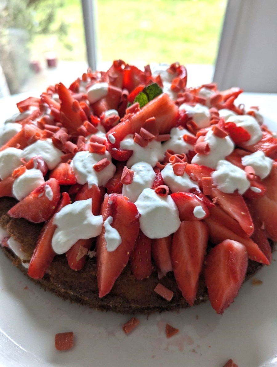 - Garnir une moitié de gâteau de crème et de fraises, poser l’autre moitié du gâteau et recommencer.