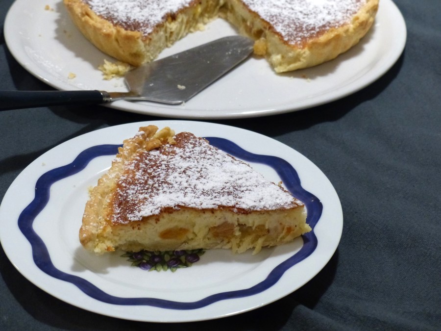 Une tarte garnie d’un mélange de poudre d’amandes, de raisins secs et d’oranges confites : très agréable dessert….