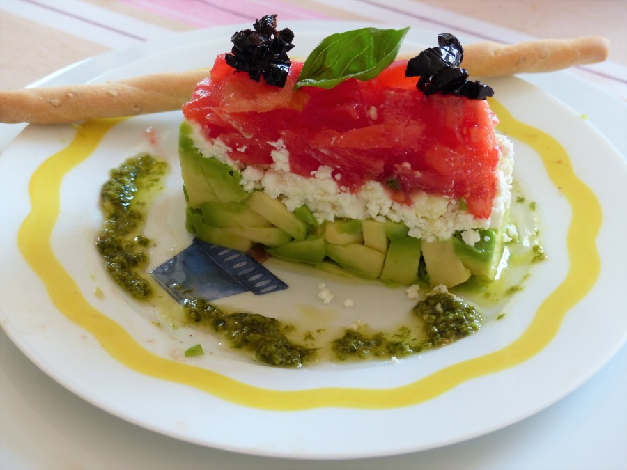 • Avec un emporte pièce, disposer une couche d’avocats, tasser avec le dos d’une petite cuillère, saler légèrement, ajouter une couche de fêta, arroser d’une goutte d’huile d’olive, bien tasser, puis terminer par une couche de tomate en tassant toujours.