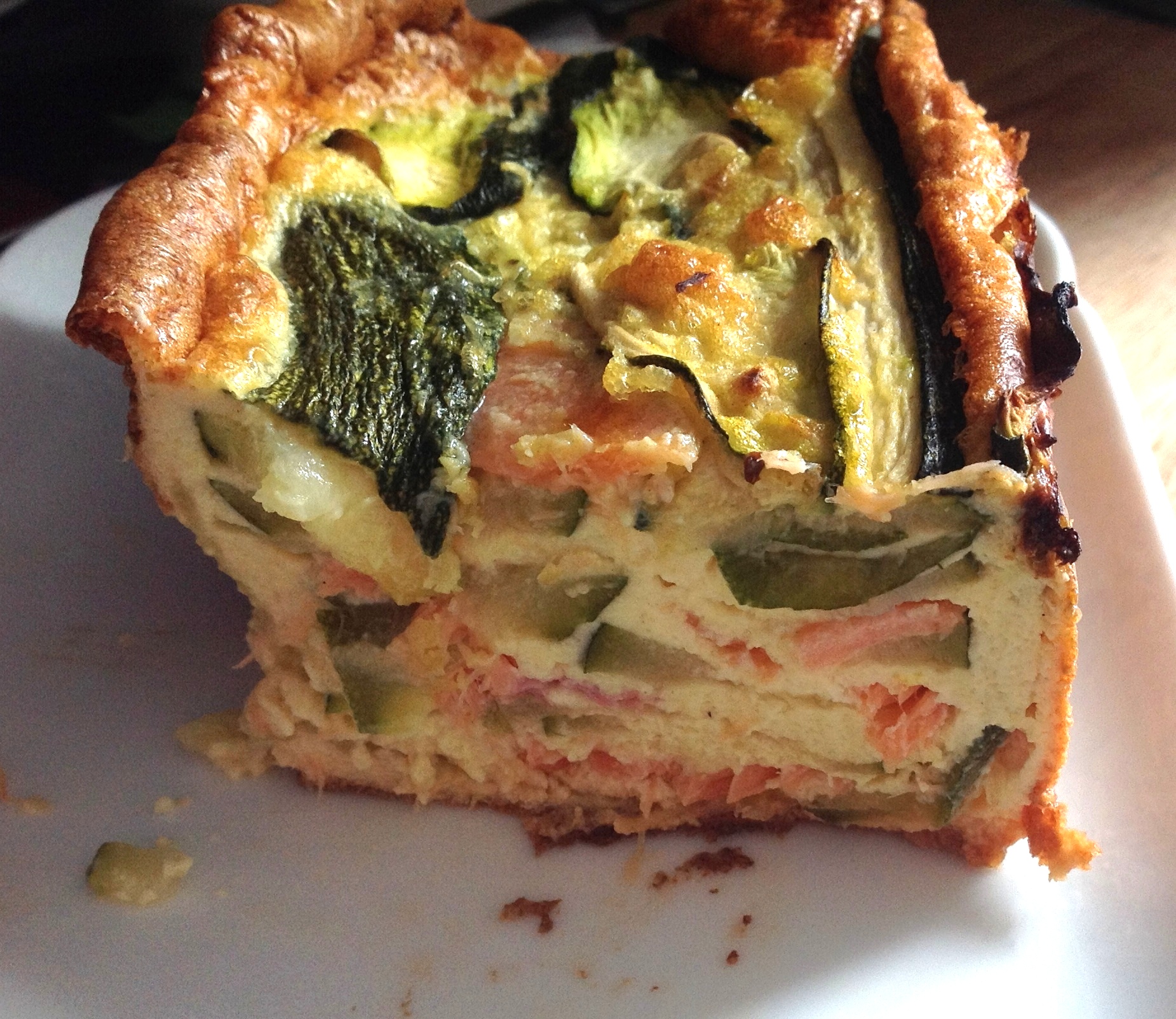 - Dans un moule à cake beurré, disposer une couche de tranches de courgettes, des tranches de saumon coupées en deux, un peu de préparation aux oeufs et recommencer….. et terminer par des courgettes.