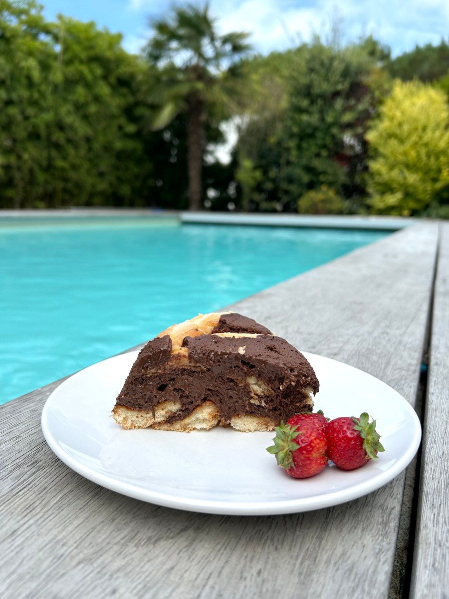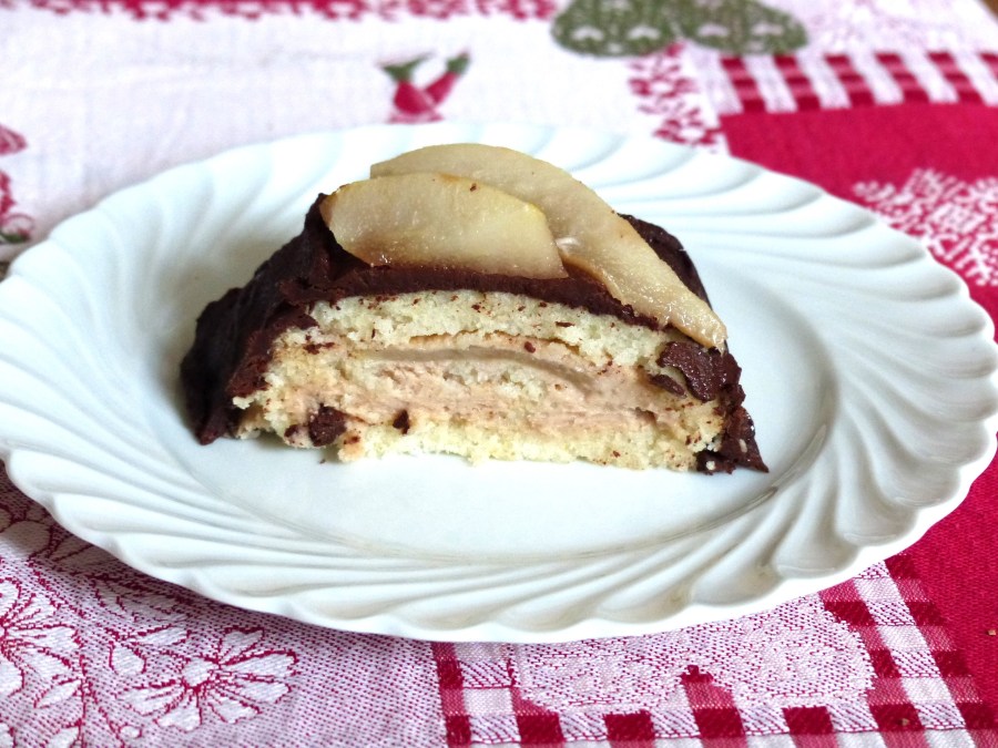 Une dacquoise avec une mousse à la crème de marrons et des lamelles de poires forment un très bon mélange…. un peu de chocolat pour la rendre encore plus gourmande. Elle se prépare 48 h avant de la servir…..