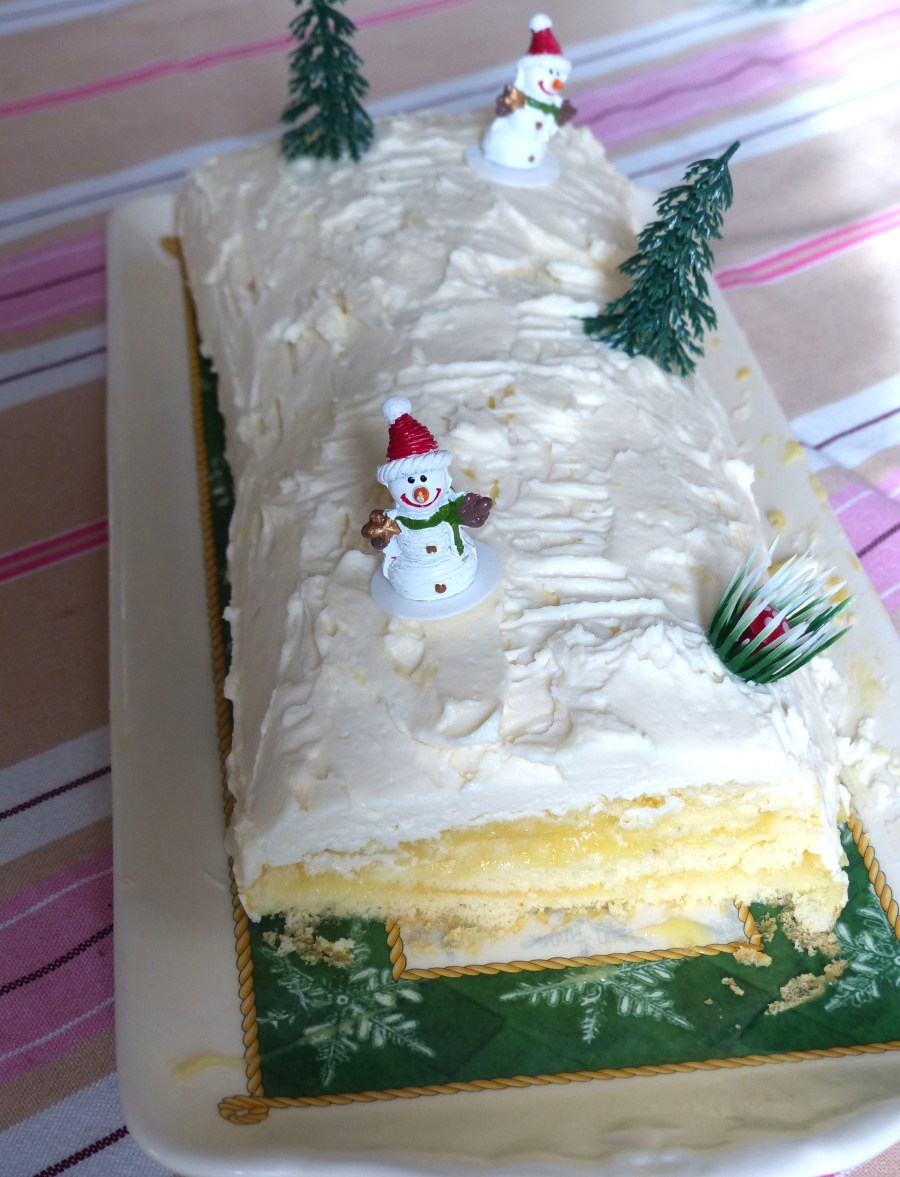 - Battre le mascarpone avec le sucre glace et le citron puis recouvrir le gâteau de cette préparation avec une sptaule, et décorer la bûche.