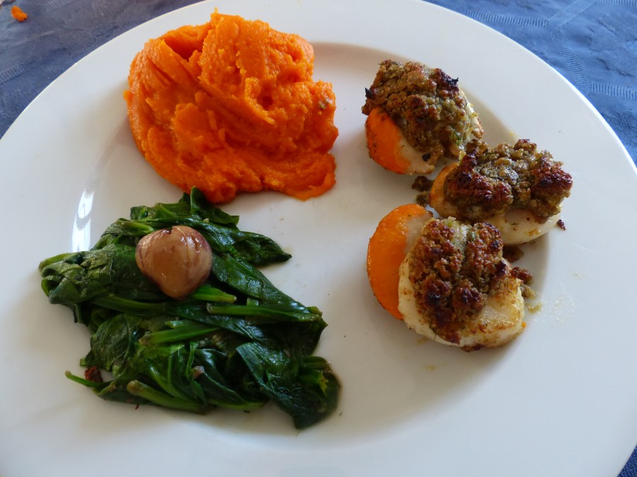 - Répartir sur les noix de St-Jacques le beurre de châtaignes.