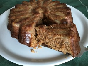 voici un délicieux  gâteau sans gluten puisqu’il est cuisiné à la farine de châtaigne et maïzena. La poire se marie très bien au goût de la châtaigne. Le pot de yaourt vide étant la mesure pour les farines et sucre.