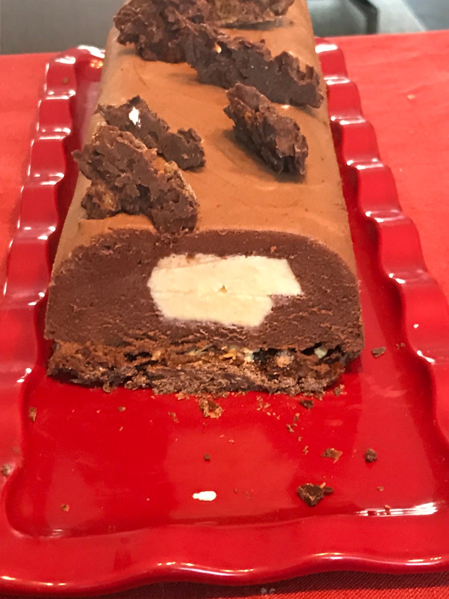 - 2h avant de servir : démouler la bûche encore congelée et la laisser tempérer au réfrigérateur et décorer avec des restes de croustillant praliné
