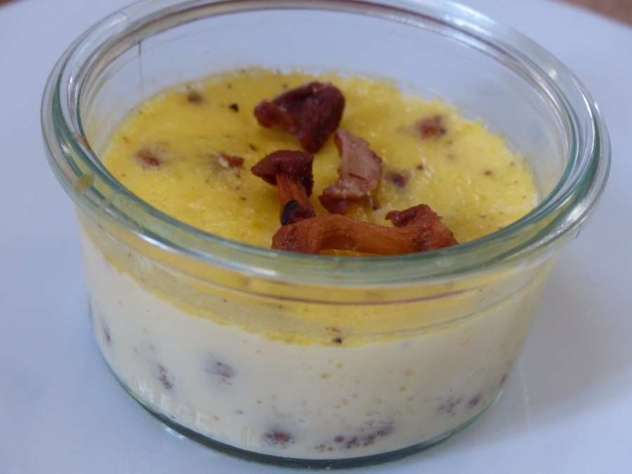 - Garder quelques girolles pour la décoration et répartir le reste des champignons dans les récipients, puis verser la préparation.