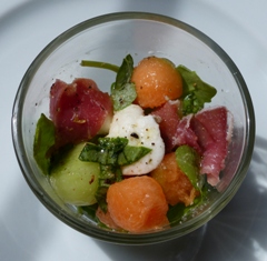 - Avec une cuillère parisienne, faire des boules de melon et de concombre et de mozzarella.