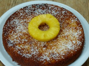 - Laisser refroidir le gâteau, le démouler, le saupoudrer de noix de coco et décorer avec la rondelle d’ananas mise de côté.