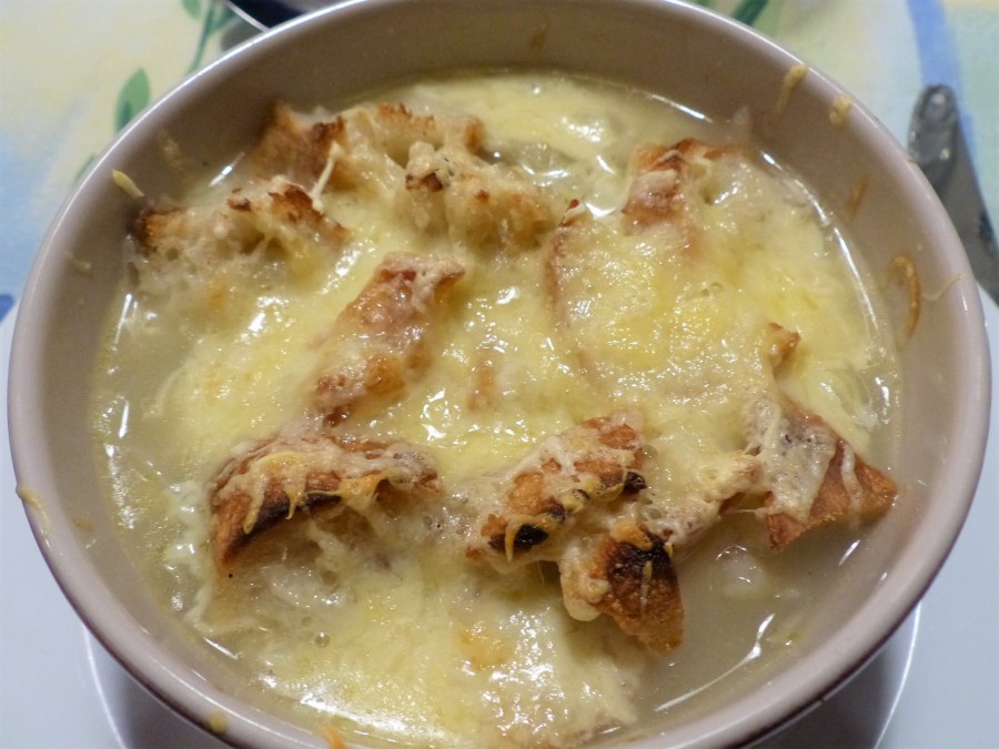 - Dans des bols individuels, répartir la soupe d’oignons, disposer les tranches de pain et ajouter largement du fromage râpé, mettre sous le grill four pour laisser gratiner quelques minutes.