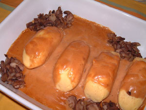 - Dans un plat à gratin allant au four, disposer un peu de sauce, poser les quenelles sans les serrer , les champignons et recouvrir de sauce.