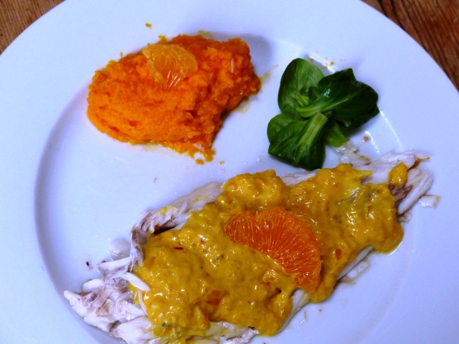 - Lever les filets de poisson, dresser sur assiette et napper de sauce, décorer de quartier de clémentine épluché.