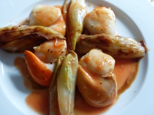 - Faire chauffer le reste de beurre dans une poêle et lorsqu’il mousse, faire saisir les noix de Saint Jacques 1 minute de chaque côté, saler, poivrer.