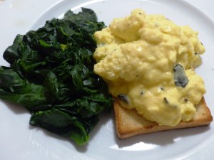 - Disposer sur assiette les tranches de brioche et répartir les oeufs brouillés.